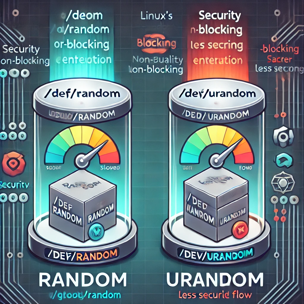 - /dev/random: 블록(blocking) 디바이스로, 충분한 엔트로피가 모일 때까지 대기합니다. 보안성이 높은 난수를 생성하지만, 엔트로피가 부족한 경우 난수 생성이 지연될 수 있습니다.