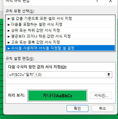 - 조건부 서식 : 행(ROW) 색상 표시 기능
