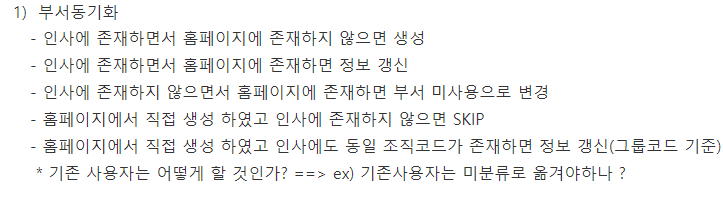 - 홈페이지에서 직접 생성 하였고 인사에도 동일 조직코드가 존재하면 정보 갱신(그룹코드 기준)