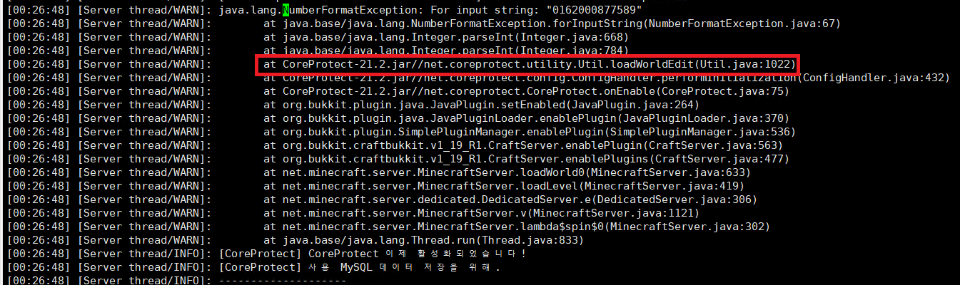 WorldEdit 플러그인의 plugin.yml 에서 Version 정보를 추출 한 후 각종 기호를 제거 ==> 숫자(Number) 값으로 정보를 생성하는 과정에서 오류가 발생 하였다.