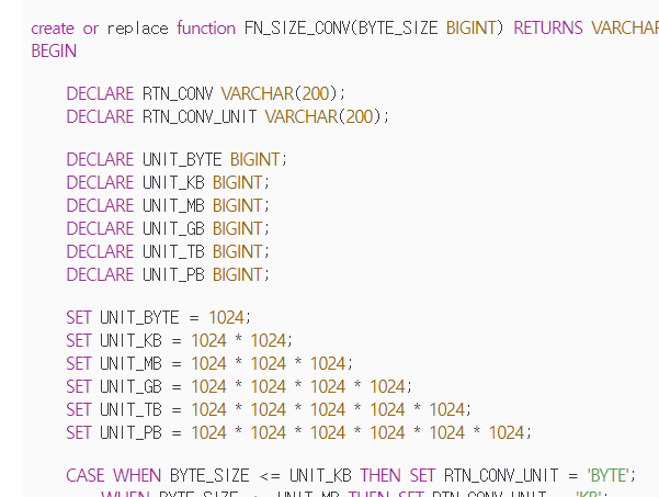 create or replace function FN_SIZE_CONV(BYTE_SIZE BIGINT) RETURNS VARCHAR(200)